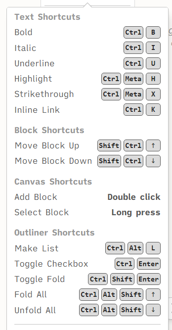 É possível ver todos os atalhos clicando na interrogação do pequeno menu à esquerda, essas são as opções:
